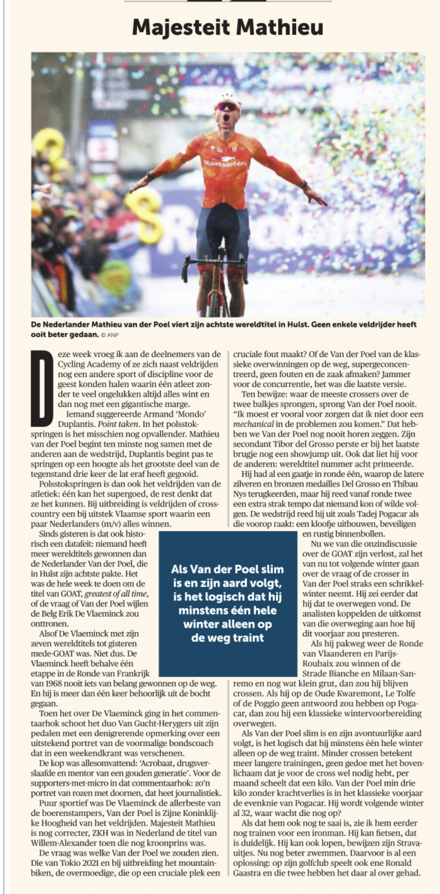 Het stopzetten van zijn topsportcontract past binnen consequent en degelijk topsportbeleid. Volgens Broeders is het een miskenning van zijn talent en zijn prestaties, en hij drukt ons nog op het hart dat het niveau in het polsstokspringen ontzettend hoog is. Dat gaat maar op voor één van die acrobaten. Jammer genoeg heet die niet Ben Broeders maar Armand ‘Mondo’ Duplantis en zelfs hij is niet zo uitzonderlijk.