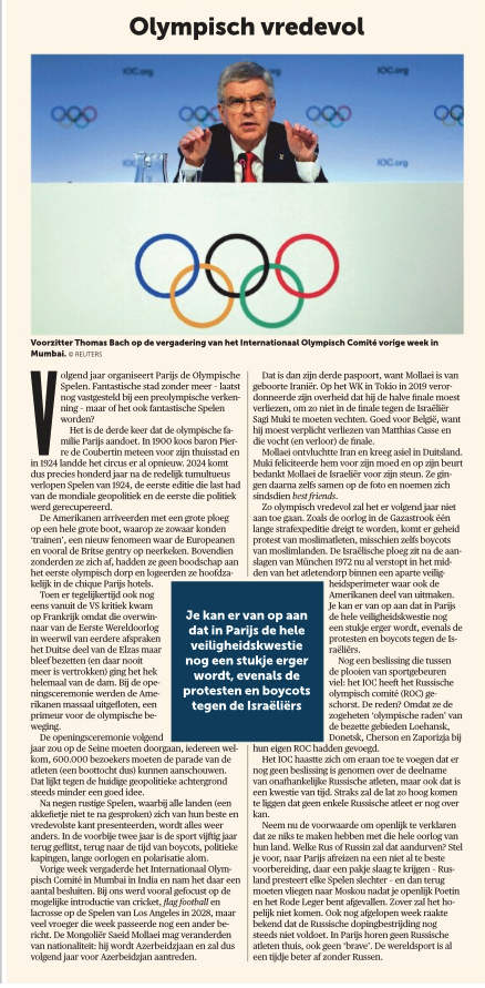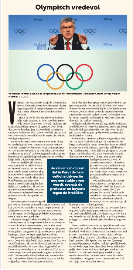 Of genocide nu de juiste omschrijving is voor wat de staat Israël al zeven decennia de Palestijnen aandoet, is niet duidelijk. Of genocide de juiste omschrijving is voor wat de Palestijnen de Joden toewensen, al acht decennia (van in de Tweede Wereldoorlog met de bedenkelijke rol van grootmoefti en Hitler- aanhanger Amin al-Hoesseini), is ook voor discussie vatbaar. Of alle voornoemde atleten zo uit de bocht gingen dat doodsbedreigingen aan hun adres op hun plaats waren, is dan weer twijfelachtig.