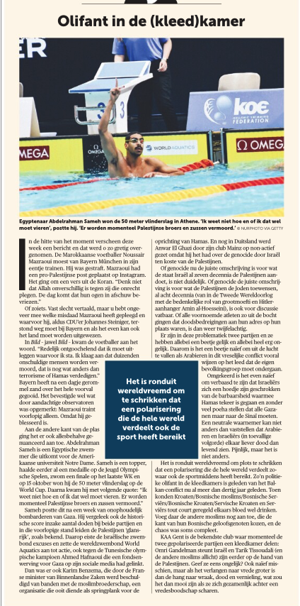 Aan de andere kant van de plas ging het er ook allesbehalve genuanceerd aan toe. Abdelrahman Sameh is een Egyptische zwemmer die uitkomt voor de Amerikaanse universiteit Notre Dame. Sameh is een topper, haalde eerder al een medaille op de Jeugd Olympische Spelen, zwom een finale op het laatste WK en op 15 oktober won hij de 50 meter vlinderslag op de World Cup. Daarna kwam hij met volgende quote: “Ik weet niet hoe en of ik dat wel moet vieren. Er worden momenteel Palestijnse broers en zussen vermoord.”
