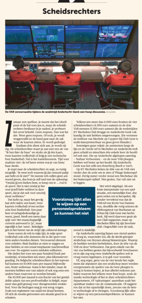 Telkens iets meer dan 6.000 euro kostten de vier scheidsrechters (4.500 euro samen) en de drie VAR-mensen (1.500 euro samen) die de wedstrijden KV Mechelen-Club Brugge en Anderlecht-Genk vakkundig de nek hebben omgewrongen. (De vermeende trekfout van Mechele op Cuypers bij Club-Gent is multi-interpreteerbaar en geen grove blunder.)
