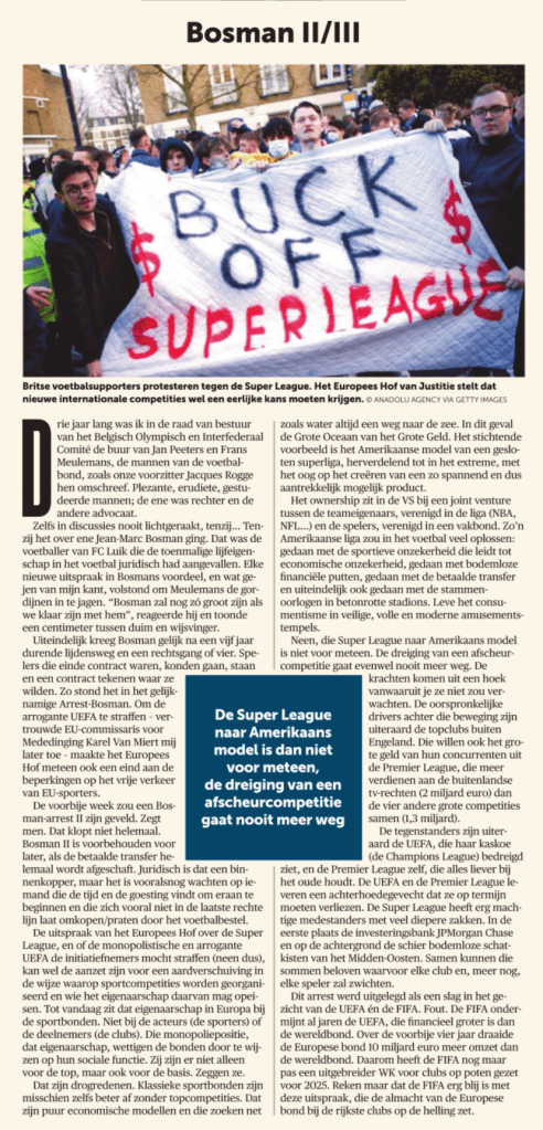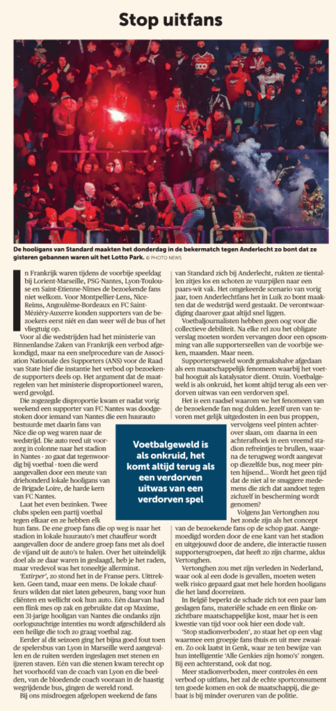 Dat lucht op, maar het gevolg laat zich raden: een kaart, twee kaarten (volleybal) of een technische fout (basketbal). Een paar keer ervaringsdeskundige geweest, jawel. Heeft een mens daar spijt van? Het maatschappelijk correcte antwoord is ‘ja’, maar eigenlijk is het ‘neen’. Beledigingen in het heetst van de strijd zijn collateral damage.