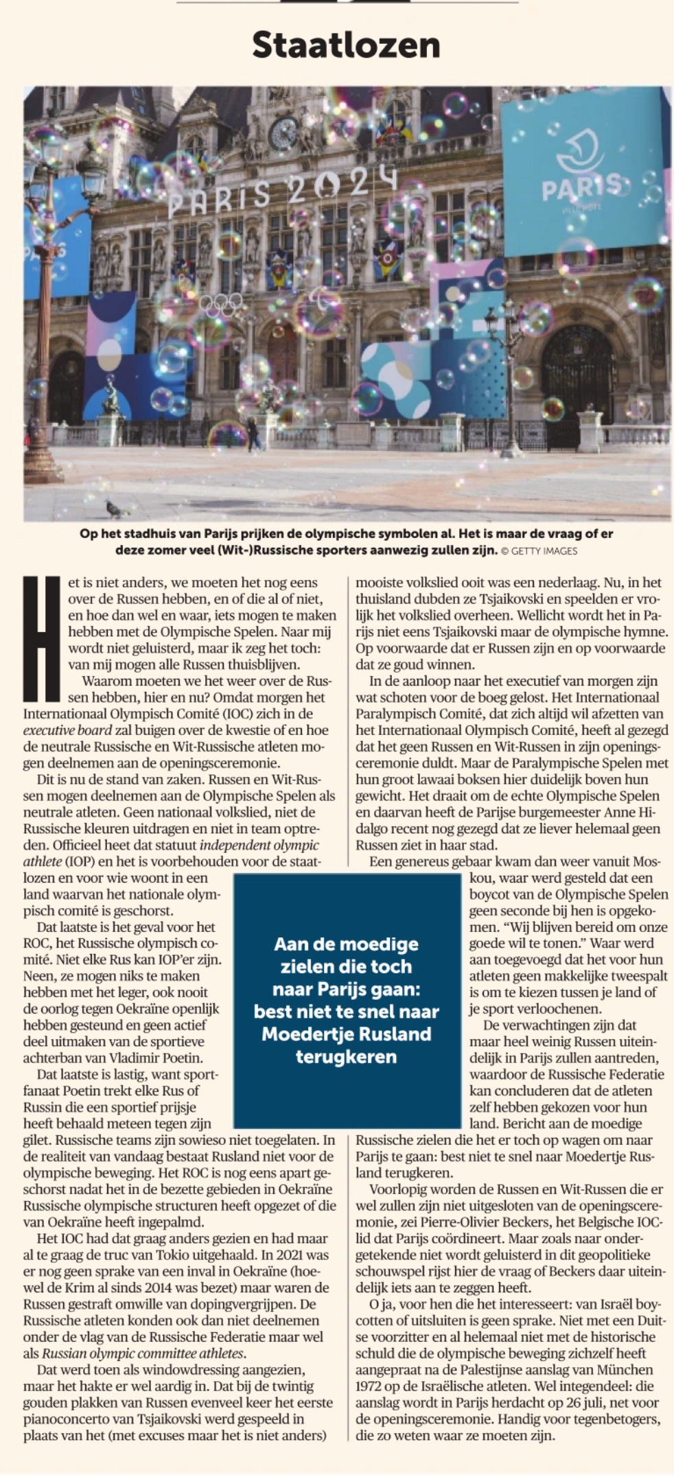 Voorlopig worden de Russen en Wit-Russen die er wel zullen zijn niet uitgesloten van de openingsceremonie, zei Pierre-Olivier Beckers, het Belgische IOC-lid dat Parijs coördineert. Maar zoals naar ondergetekende niet wordt geluisterd in dit geopolitieke schouwspel rijst hier de vraag of Beckers daar uiteindelijk iets aan te zeggen heeft.