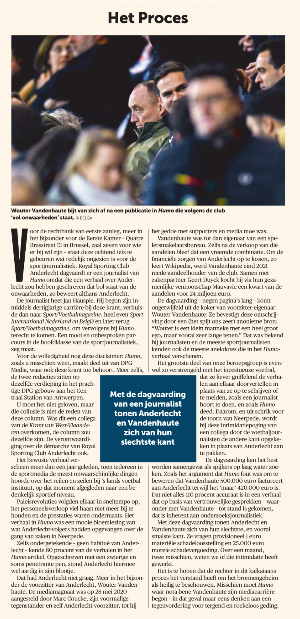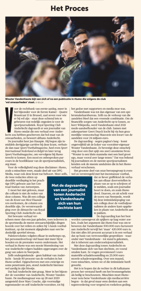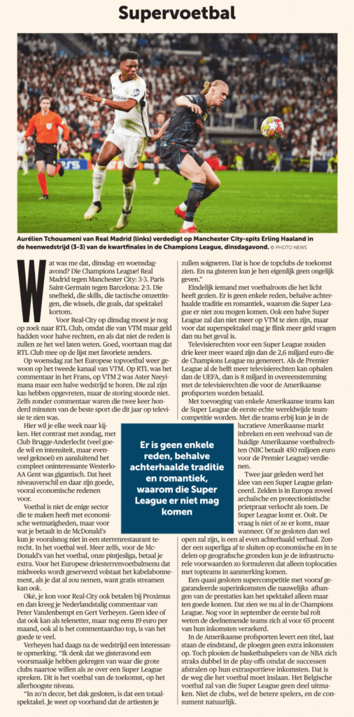 Als het Union niet wordt, dan is het Club Brugge gegund, meer dan Anderlecht dat aan een geldinfuus hangt en daar nog wel voor zal boeten. Club is toch de best geleide en best voetballende ploeg van het land, als ze tenminste aan het voetballen gaan. Een bijkomende reden om het Club te gunnen is dat het gezeur over de drukke play-offs dan zal verstommen. De enige reden om het Club niet te gunnen is Bart Verhaeghe, met ruime voorsprong de engste mens in het Belgische voetbal.