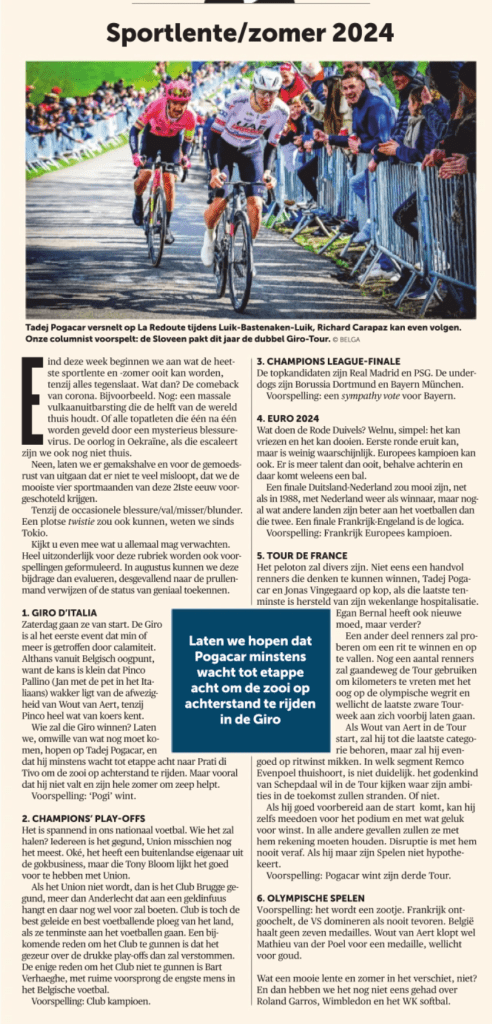 Neen, laten we er gemakshalve en voor de gemoedsrust van uitgaan dat er niet te veel misloopt, dat we de mooiste vier sportmaanden van deze 21ste eeuw voorgeschoteld krijgen.