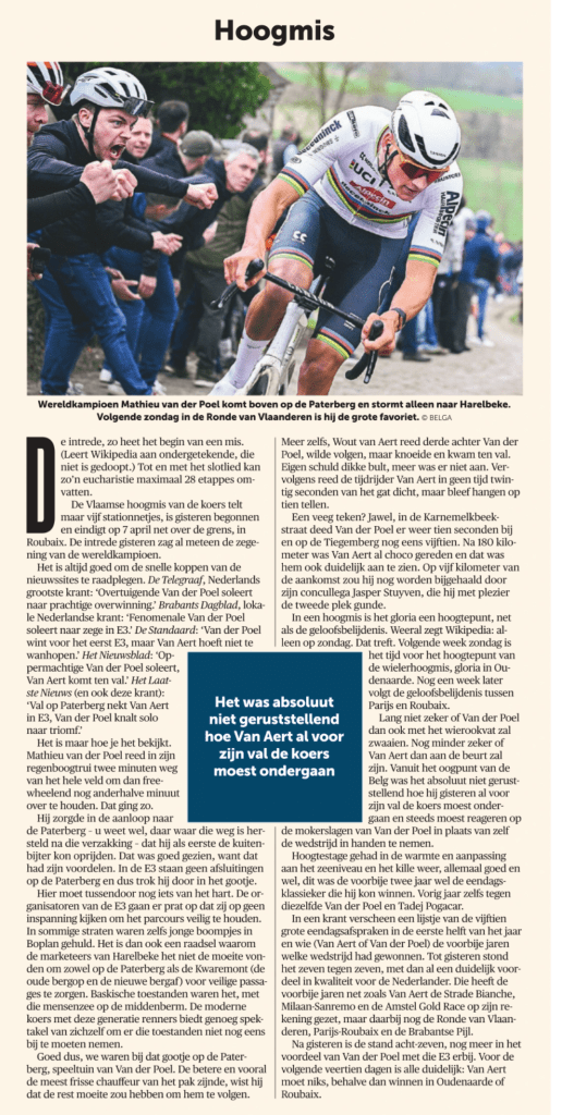 Het is altijd goed om de snelle koppen van de nieuwssites te raadplegen. De Telegraaf, Nederlands grootste krant: ‘Overtuigende Van der Poel soleert naar prachtige overwinning.’ Brabants Dagblad, lokale Nederlandse krant: ‘Fenomenale Van der Poel soleert naar zege in E3.’ De Standaard: ‘Van der Poel wint voor het eerst E3, maar Van Aert hoeft niet te wanhopen.’ Het Nieuwsblad: ‘Oppermachtige Van der Poel soleert, Van Aert komt ten val.’ Het Laatste Nieuws (en ook deze krant): ‘Val op Paterberg nekt Van Aert in E3, Van der Poel knalt solo naar triomf.’