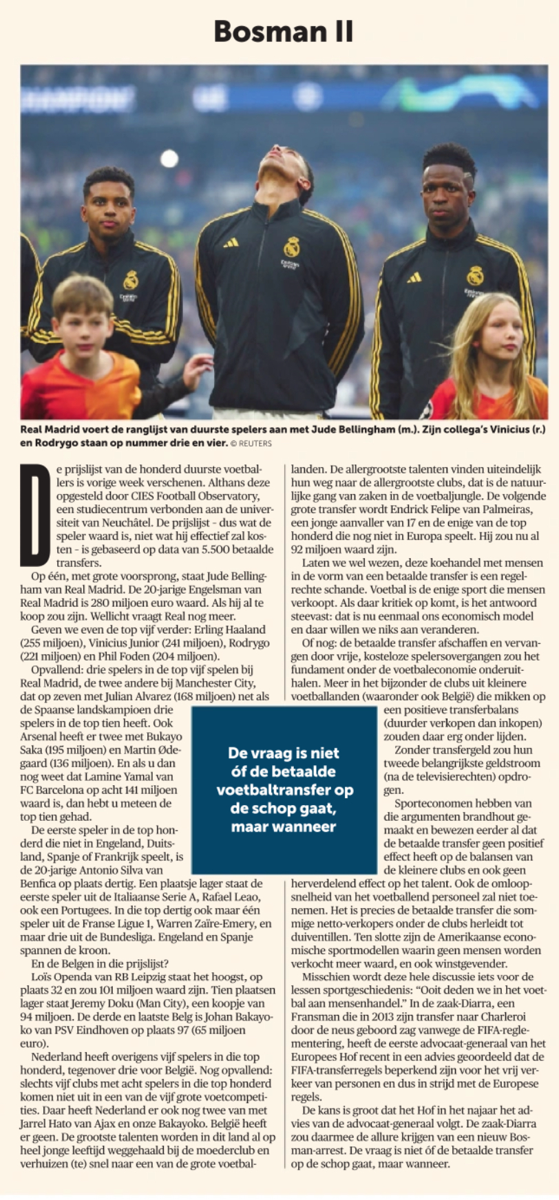 Nederland heeft overigens vijf spelers in die top honderd, tegenover drie voor België. Nog opvallend: slechts vijf clubs met acht spelers in die top honderd komen niet uit in een van de vijf grote voetcompetities. Daar heeft Nederland er ook nog twee van met Jarrel Hato van Ajax en onze Bakayoko. België heeft er geen. De grootste talenten worden in dit land al op heel jonge leeftijd weggehaald bij de moederclub en verhuizen (te) snel naar een van de grote voetballanden. De allergrootste talenten vinden uiteindelijk hun weg naar de allergrootste clubs, dat is de natuurlijke gang van zaken in de voetbaljungle. De volgende grote transfer wordt Endrick Felipe van Palmeiras, een jonge aanvaller van 17 en de enige van de top honderd die nog niet in Europa speelt. Hij zou nu al 92 miljoen waard zijn.