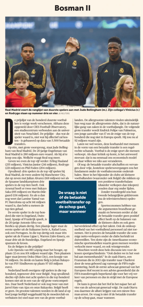 De prijslijst van de honderd duurste voetballers is vorige week verschenen. Althans deze opgesteld door CIES Football Observatory, een studiecentrum verbonden aan de universiteit van Neuchâtel. De prijslijst – dus wat de speler waard is, niet wat hij effectief zal kosten – is gebaseerd op data van 5.500 betaalde transfers.