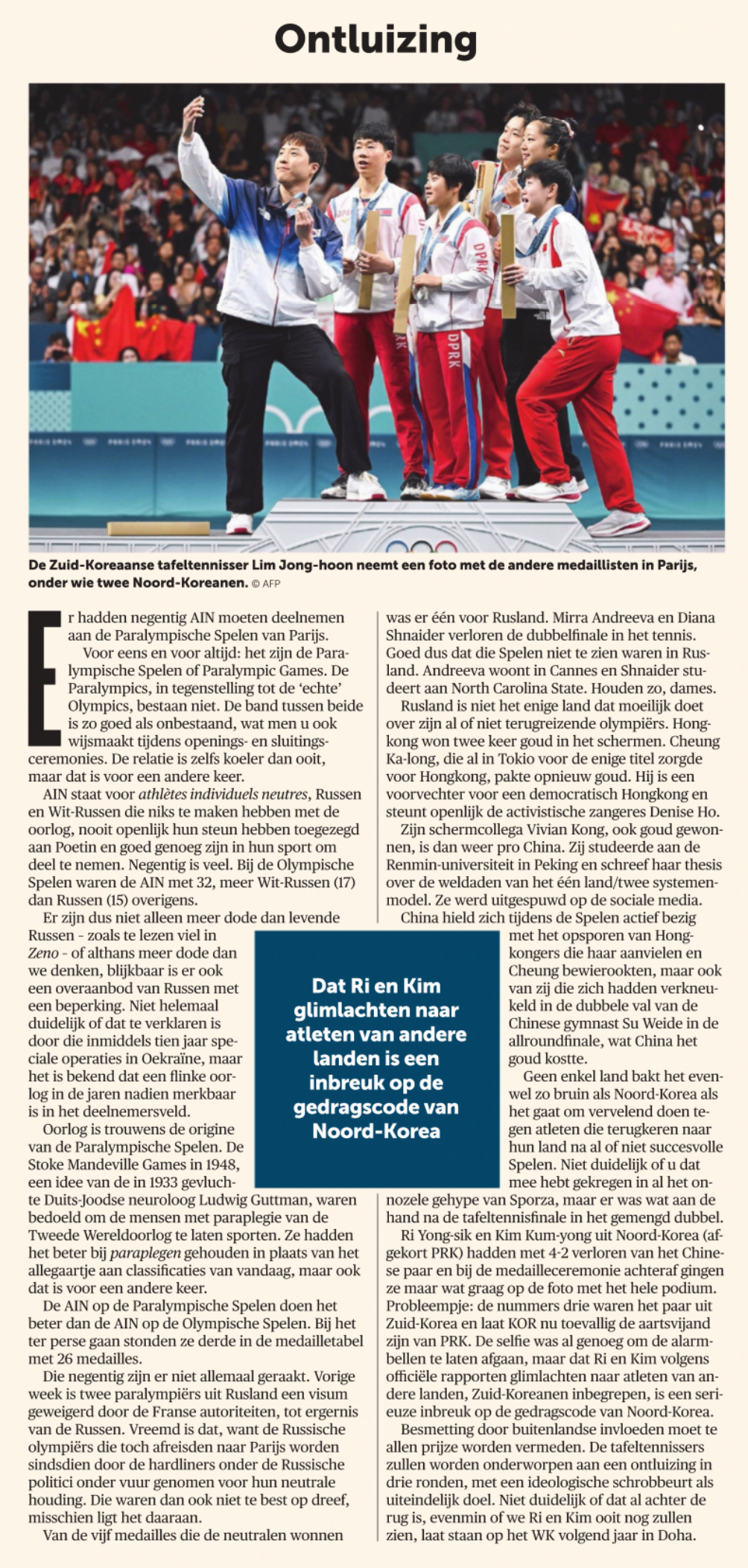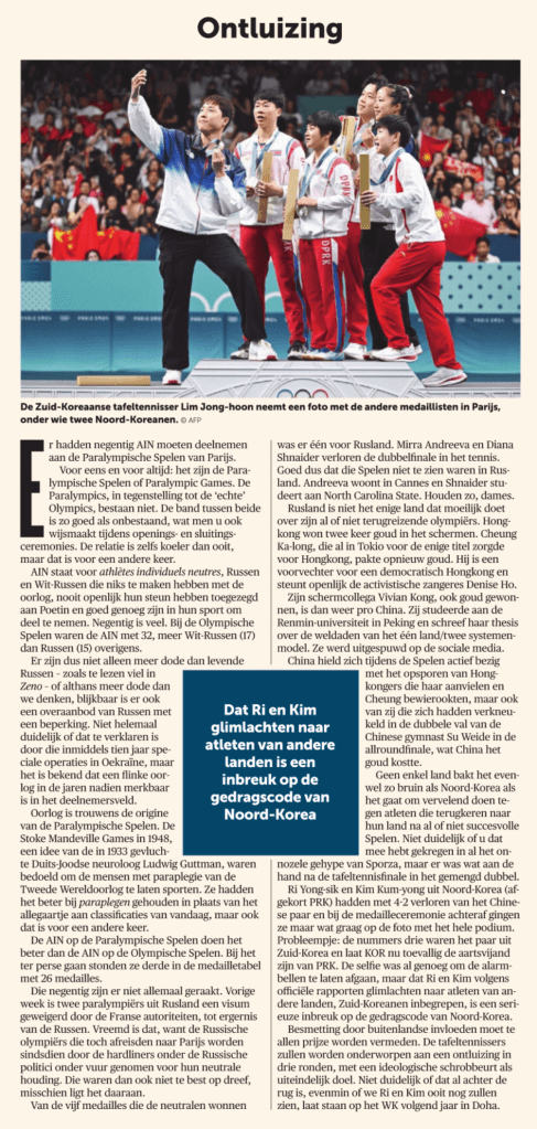 Bovendien zijn de Paralympische Spelen als speeltuin van rijke (vooral Westerse) landen en landen met een staatsgestuurde topsport zelf wellicht het meest exclusieve mondiale sportevent. Delegaties uit Sub- Saharalanden – Zuid-Afrika uitgezonderd – bestaan uit één of twee atleten en die komen echt niet uit de sloppen van Ouagadougou of Kinshasa. Zelfs in de rijke landen is de paralympische sport een voorrecht voor enkelingen die toevallig de weg hebben gevonden. In Oekraïne, als zevende land geëindigd in Parijs, hebben ze dan weer sinds 2014 een nieuw blik talent opengetrokken, mede met dank aan Poetin.