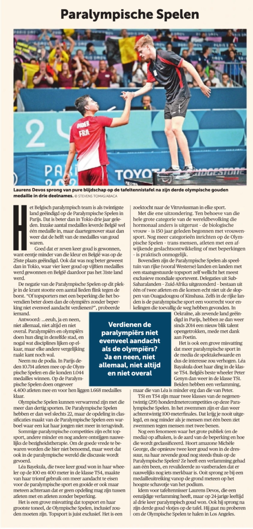 Idem voor tafeltennisser Laurens Devos, die een eenzijdige verlamming heeft, maar op 24-jarige leeftijd al drie keer paralympisch goud won. Ook hij sprong na zijn derde goud vlotjes op de tafel. Hij gaat nu proberen om de Olympische Spelen te halen in Los Angeles.