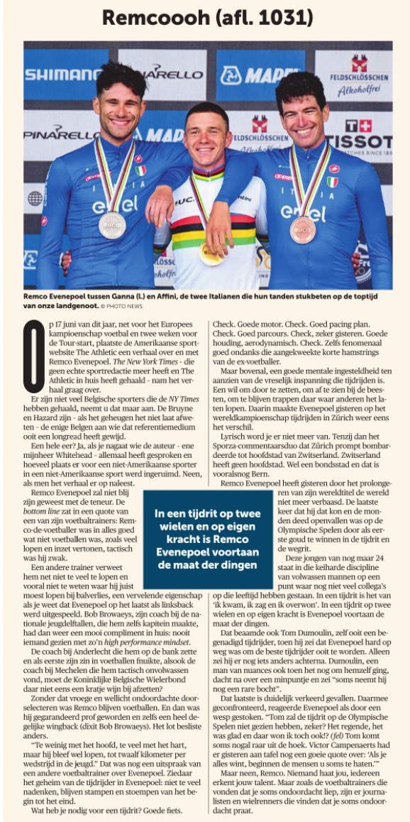 Op 17 juni van dit jaar, net voor het Europees kampioenschap voetbal en twee weken voor de Tour-start, plaatste de Amerikaanse sportwebsite The Athletic een verhaal over en met Remco Evenepoel. The New York Times – die geen echte sportredactie meer heeft en The Athletic in huis heeft gehaald – nam het verhaal graag over.