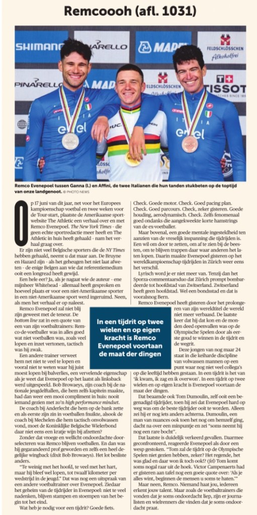 Remco Evenepoel zal niet blij zijn geweest met de teneur. De bottom line zat in een quote van een van zijn voetbaltrainers: Remco-de-voetballer was in alles goed wat niet voetballen was, zoals veel lopen en inzet vertonen, tactisch was hij zwak.