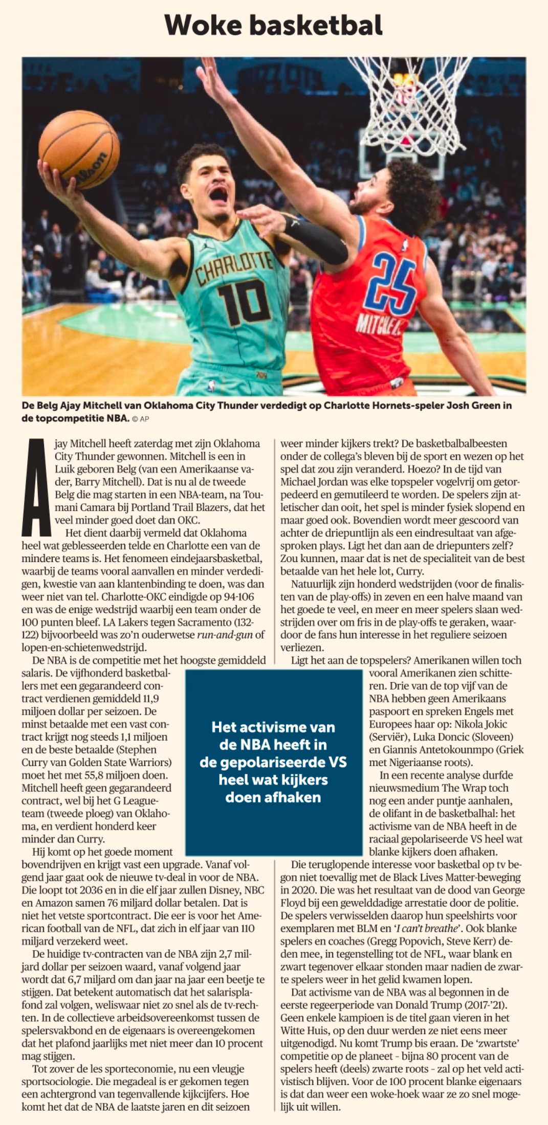 Dat activisme van de NBA was al begonnen in de eerste regeerperiode van Donald Trump (2017-’21). Geen enkele kampioen is de titel gaan vieren in het Witte Huis, op den duur werden ze niet eens meer uitgenodigd. Nu komt Trump bis eraan. De ‘zwartste’ competitie op de planeet – bijna 80 procent van de spelers heeft (deels) zwarte roots – zal op het veld activistisch blijven. Voor de 100 procent blanke eigenaars is dat dan weer een woke-hoek waar ze zo snel mogelijk uit willen.