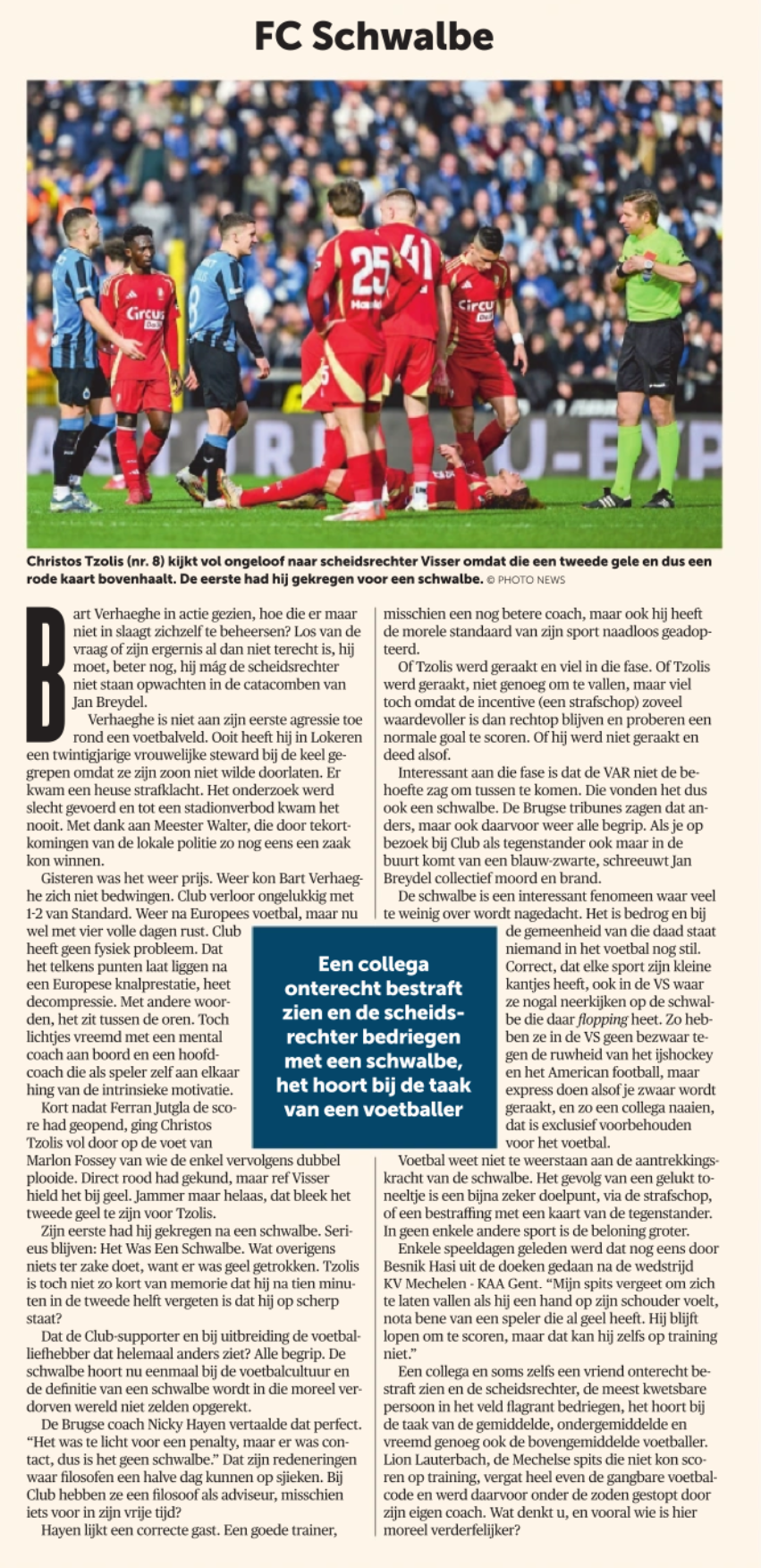 Dat de Club-supporter en bij uitbreiding de voetballiefhebber dat helemaal anders ziet? Alle begrip. De schwalbe hoort nu eenmaal bij de voetbalcultuur en de definitie van een schwalbe wordt in die moreel verdorven wereld niet zelden opgerekt.