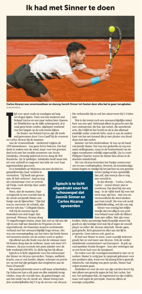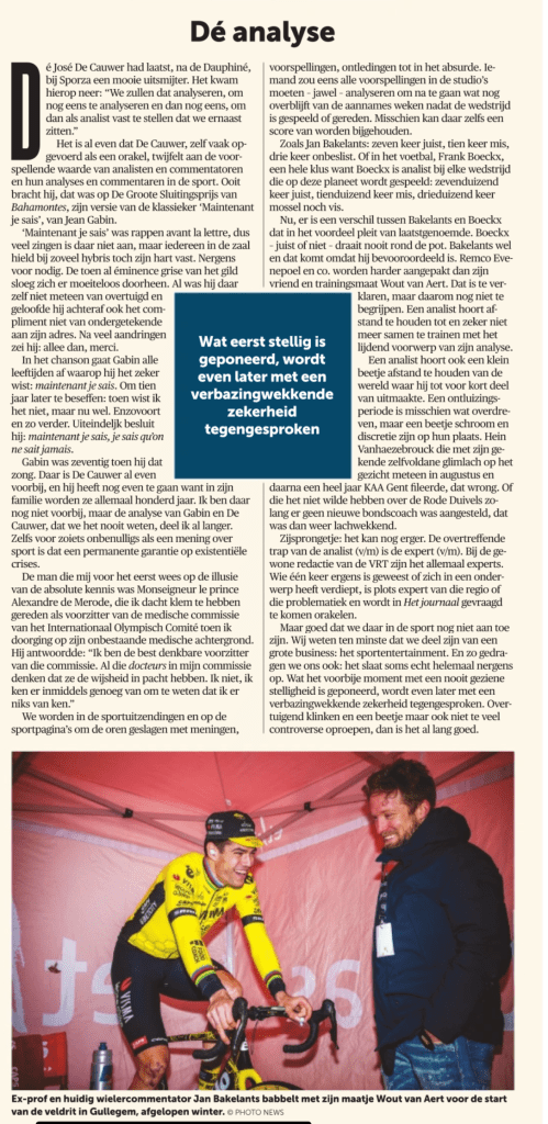 Nu, er is een verschil tussen Bakelants en Boeckx dat in het voordeel pleit van laatstgenoemde. Boeckx – juist of niet – draait nooit rond de pot. Bakelants wel en dat komt omdat hij bevooroordeeld is. Remco Evenepoel en co. worden harder aangepakt dan zijn vriend en trainingsmaat Wout van Aert. Dat is te verklaren, maar daarom nog niet te begrijpen. Een analist hoort afstand te houden tot en zeker niet meer samen te trainen met het lijdend voorwerp van zijn analyse.