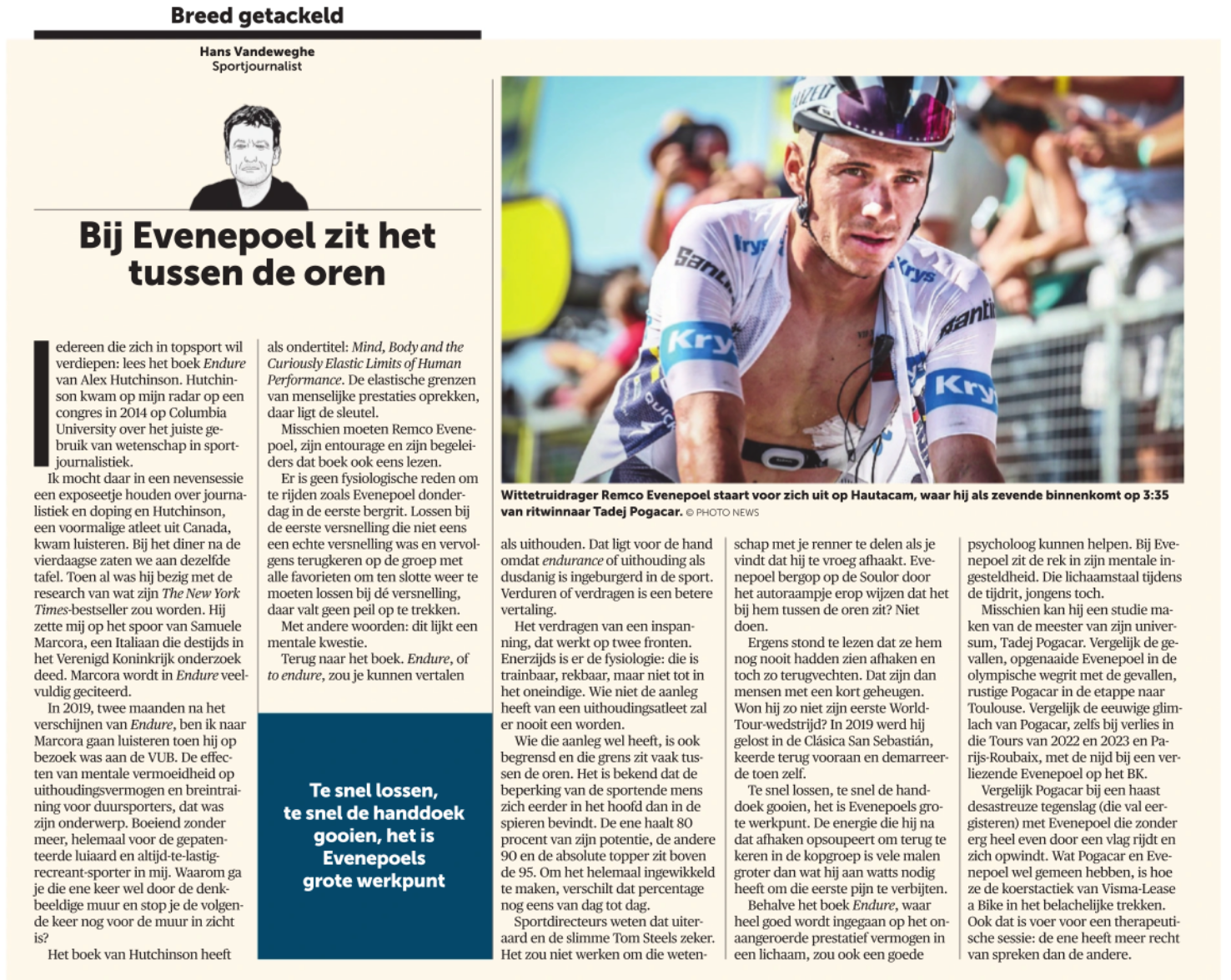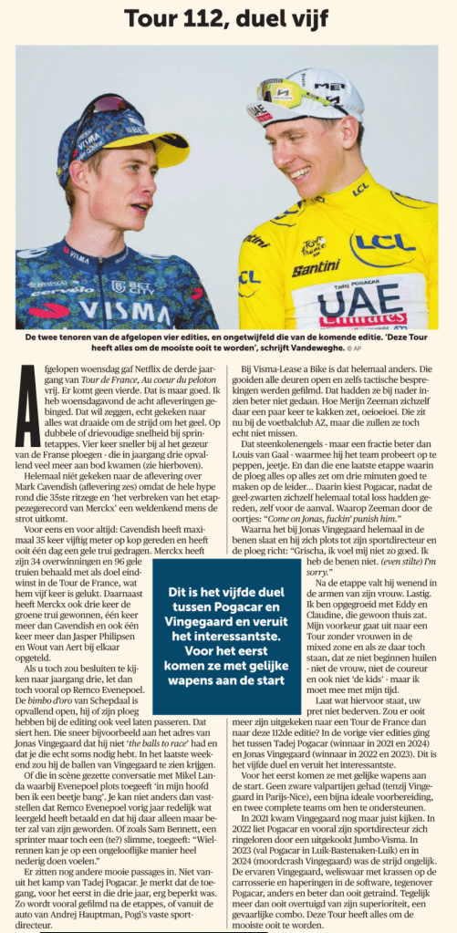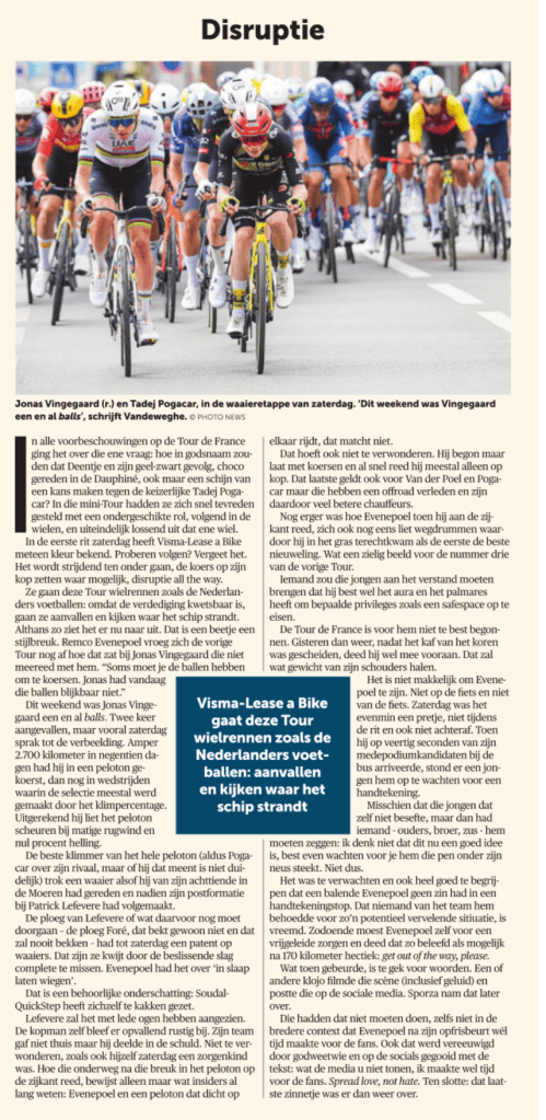 Of neem Remco Evenepoel. Waarom heeft die bijvoorbeeld na de Dauphiné niet deze vraag gekregen: “Jij wil de kloof op Pogacar en Vingegaard dichten, maar het ziet er naar uit dat dit voorlopig niet te best lukt. Integendeel, je wordt nu zelfs belaagd door jongere collega’s.” Om te besluiten met de Sporza-dooddoener “wat gaat er nu in je om?”