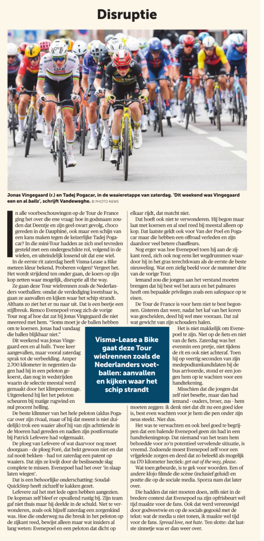 Jan Bakelants heeft gelijk. Frank Vandenbroucke en Tom Boonen gingen geheel of gedeeltelijk ten onder aan roem (en coke) en waren seriële vreemdgaanders. Remco Evenepoel is niets van dat alles. Geen alcohol, pas getrouwd, nooit in de boekskes. Het meest aparte nieuws dit jaar was dat hij had leren bidden van zijn vrouw.