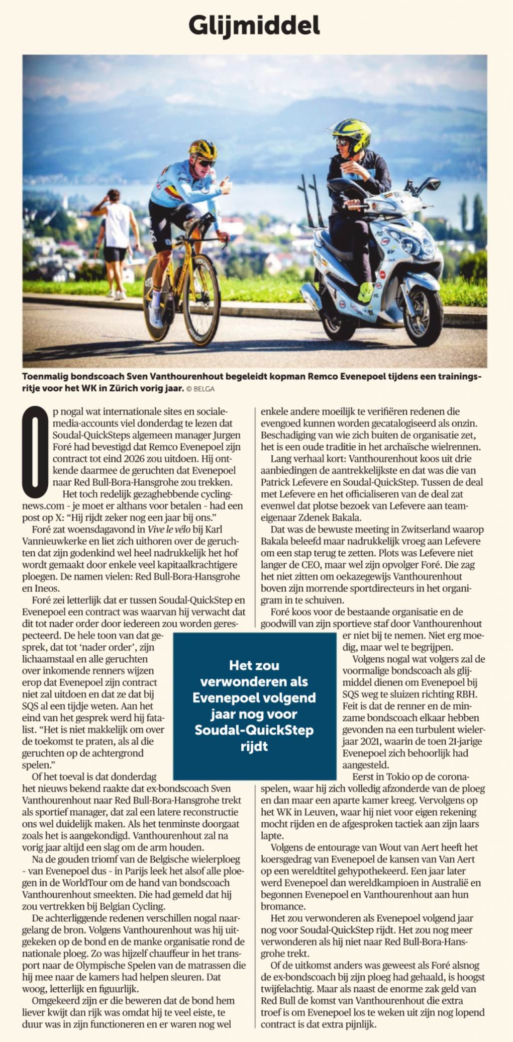 Maar Stef Clement heeft natuurlijk ook een beetje gelijk als hij de rol van de media in België, en meer nog de media in Vlaanderen, in het vizier neemt. Evenepoel was nog maar net uit de pampers toen hij al in een uitzending van het wereldkampioenschap voor junioren in Innsbruck over het paard werd getild door het duo Wuyts-De Cauwer.