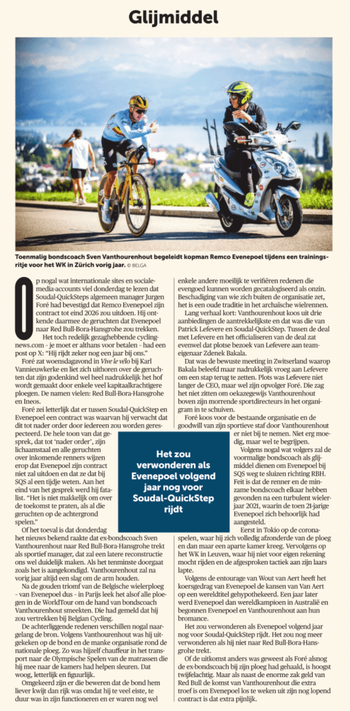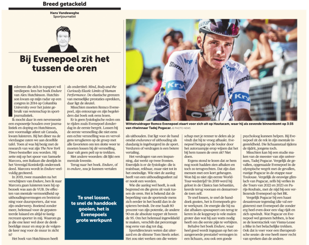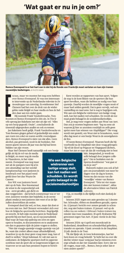 Evenepoel deed dat wel, en hoe, maar dat doet er nu even niet toe. Stef Clement verwondert zich over hoe de Belgische sportmedia berichten. Begrijpelijk en terecht. Ik heb mijn mooiste jaren in Nederland gewerkt bij een heel mooi, op en top journalistiek blad waar de baas mij opdroeg om oren en ogen open te houden, te documenteren en te analyseren om dan te gepasten tijde de juiste vragen te stellen.