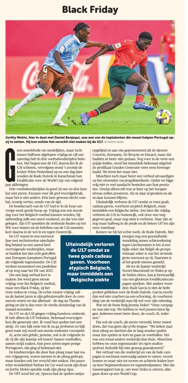 Om een lang verhaal kort te maken: het werd geen mooie vrijdag voor het Belgisch voetbal, maar een Black Friday, zij het twee weken te vroeg. De echte zwarte vrijdag valt – na de laatste jaren te zijn gebrainwasht door de commercie weten we dat allemaal – de dag na Thanksgiving en dat is dan weer de vierde donderdag van de maand november.