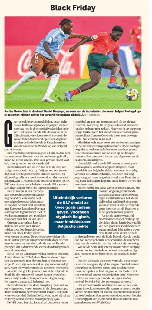 Uiteindelijk verloren de U17 omdat ze twee goals cadeau gaven, voorheen atypisch Belgisch, maar inmiddels een Belgische ziekte. Iets later die vrijdag verloren de U21 in Oostenrijk, ook door een weggegeven goal, maar nog niets is verloren. Daar zijn ze nog maar halfweg in de poule en de betere U17’ers zijn weer inzetbaar.