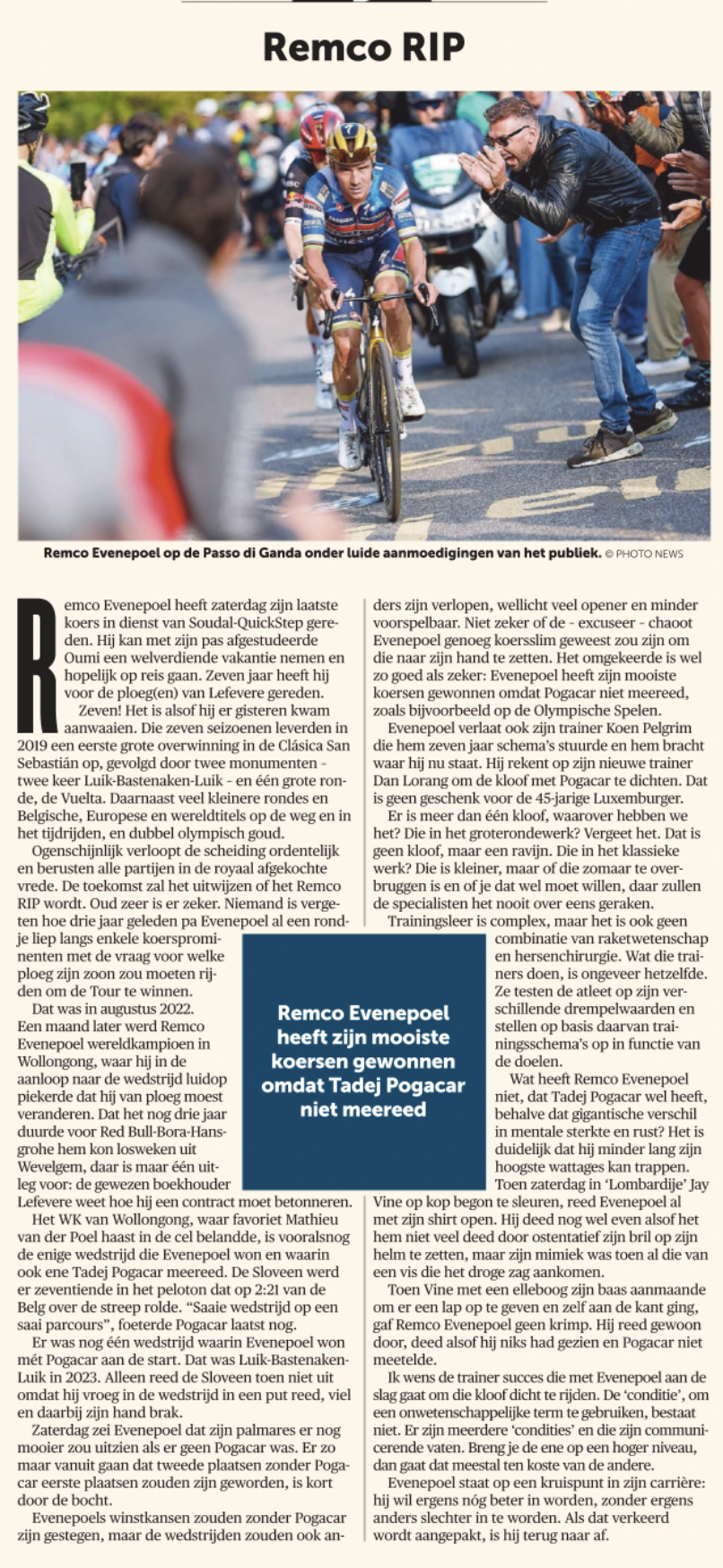 Ogenschijnlijk verloopt de scheiding ordentelijk en berusten alle partijen in de royaal afgekochte vrede. De toekomst zal het uitwijzen of het Remco RIP wordt. Oud zeer is er zeker. Niemand is vergeten hoe drie jaar geleden pa Evenepoel al een rondje liep langs enkele koersprominenten met de vraag voor welke ploeg zijn zoon zou moeten rijden om de Tour te winnen.