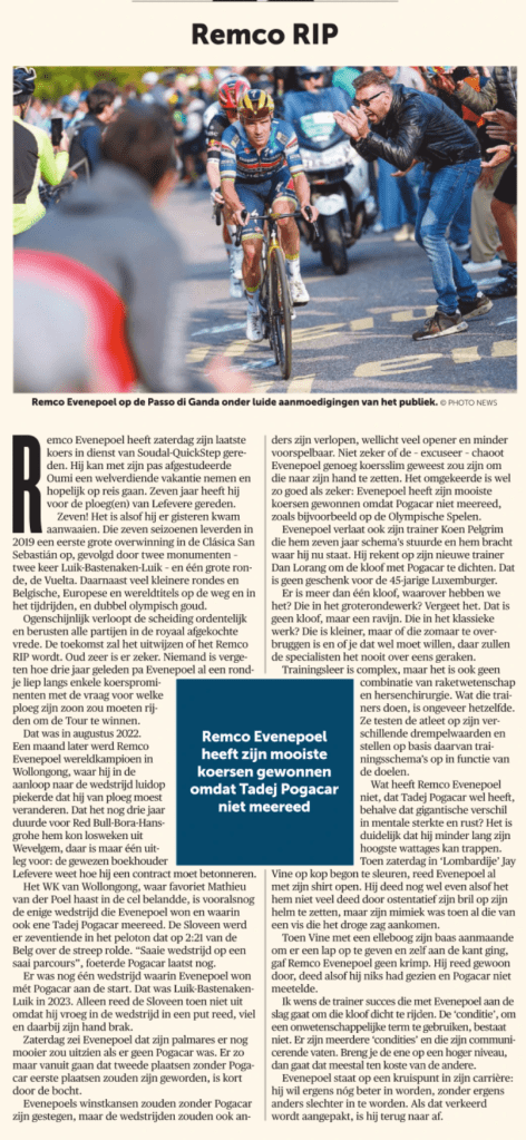 Wat heeft Remco Evenepoel niet, dat Tadej Pogacar wel heeft, behalve dat gigantische verschil in mentale sterkte en rust? Het is duidelijk dat hij minder lang zijn hoogste wattages kan trappen. Toen zaterdag in ‘Lombardije’ Jay Vine op kop begon te sleuren, reed Evenepoel al met zijn shirt open. Hij deed nog wel even alsof het hem niet veel deed door ostentatief zijn bril op zijn helm te zetten, maar zijn mimiek was toen al die van een vis die het droge zag aankomen.Toen Vine met een elleboog zijn baas aanmaande om er een lap op te geven en zelf aan de kant ging, gaf Remco Evenepoel geen krimp. Hij reed gewoon door, deed alsof hij niks had gezien en Pogacar niet meetelde.Ik wens de trainer succes die met Evenepoel aan de slag gaat om die kloof dicht te rijden. De ‘conditie’, om een onwetenschappelijke term te gebruiken, bestaat niet. Er zijn meerdere ‘condities’ en die zijn communicerende vaten. Breng je de ene op een hoger niveau, dan gaat dat meestal ten koste van de andere.