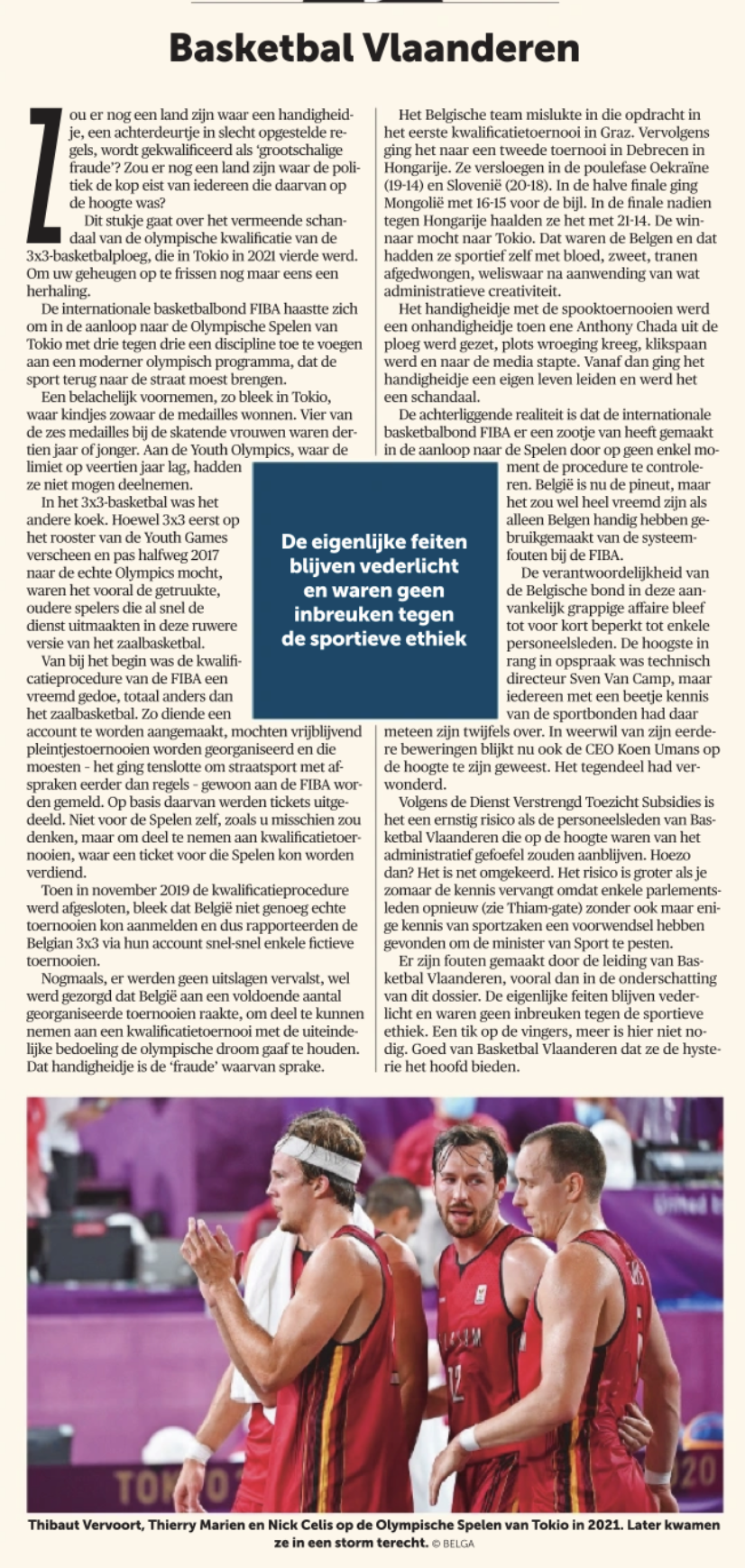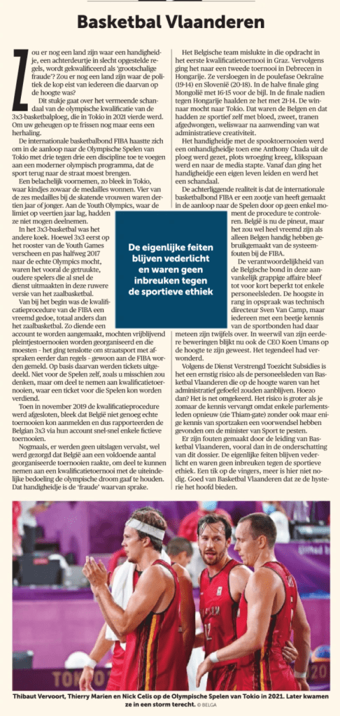 Dit stukje gaat over het vermeende schandaal van de olympische kwalificatie van de 3×3-basketbalploeg, die in Tokio in 2021 vierde werd. Om uw geheugen op te frissen nog maar eens een herhaling.