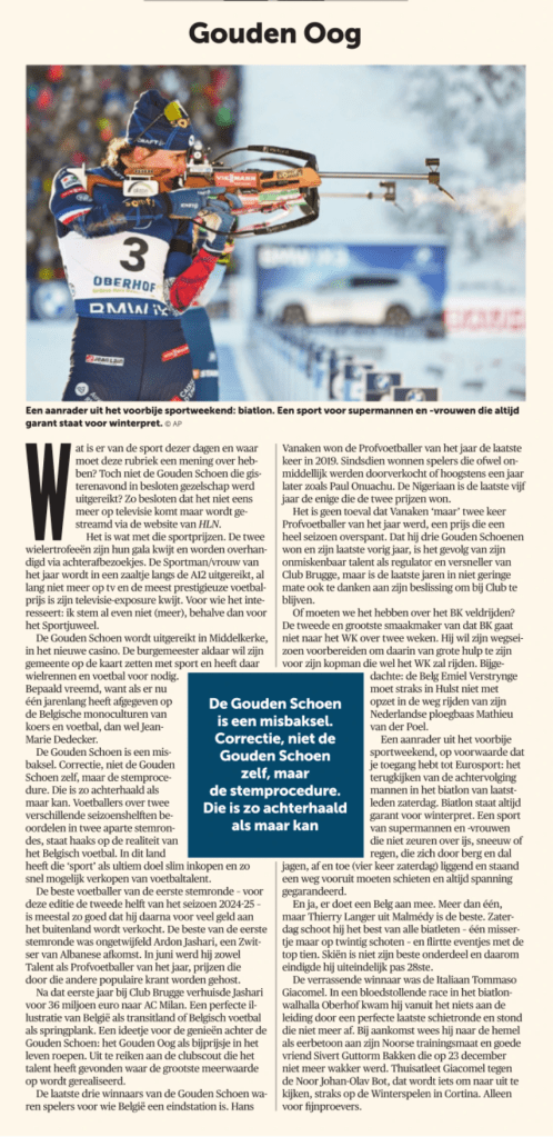 Wat is er van de sport dezer dagen en waar moet deze rubriek een mening over hebben? Toch niet de Gouden Schoen die gisterenavond in besloten gezelschap werd uitgereikt? Zo besloten dat het niet eens meer op televisie komt maar wordt gestreamd via de website van HLN.