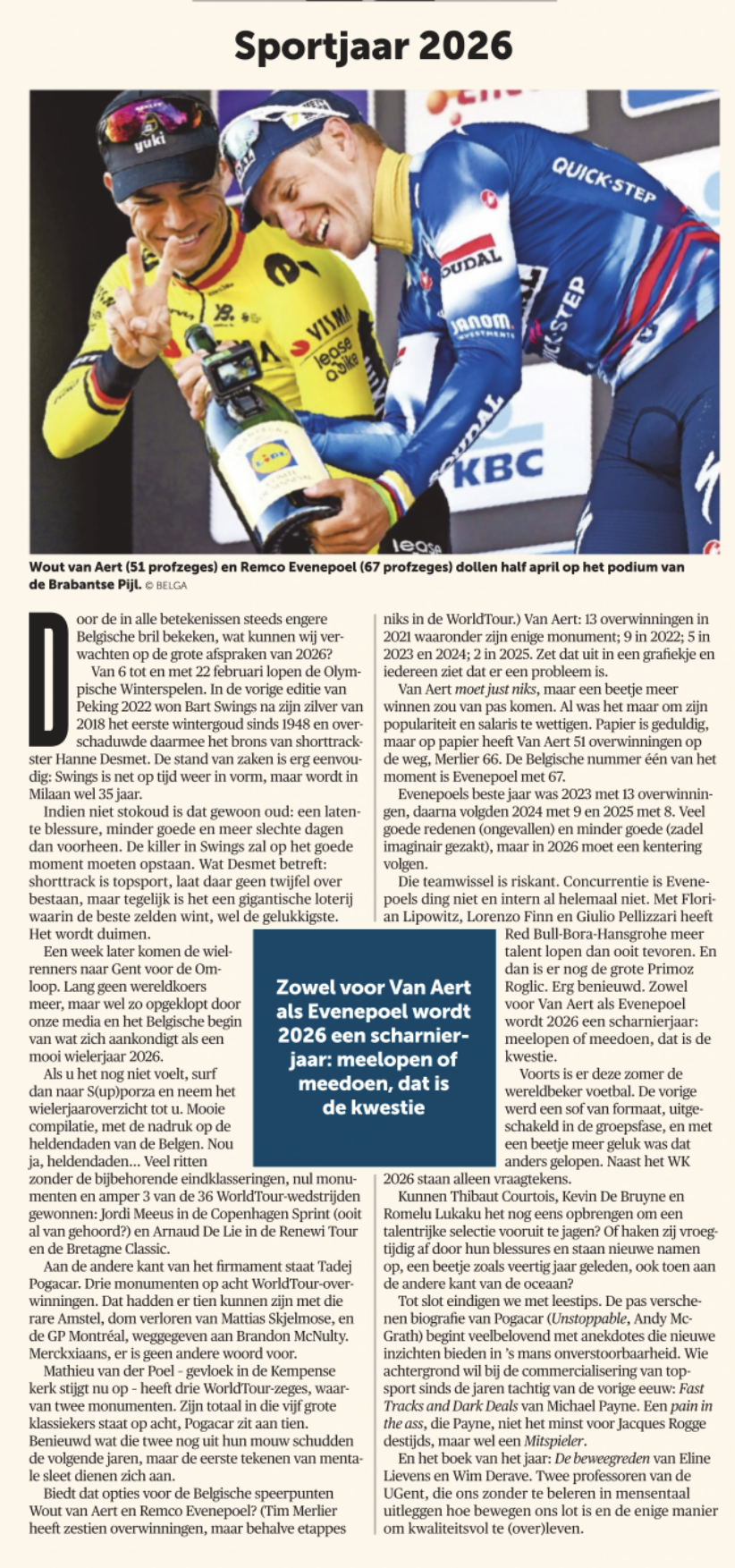 Die teamwissel is riskant. Concurrentie is Evenepoels ding niet en intern al helemaal niet. Met Florian Lipowitz, Lorenzo Finn en Giulio Pellizzari heeft Red Bull-Bora-Hansgrohe meer talent lopen dan ooit tevoren. En dan is er nog de grote Primoz Roglic. Erg benieuwd. Zowel voor Van Aert als Evenepoel wordt 2026 een scharnierjaar: meelopen of meedoen, dat is de kwestie.