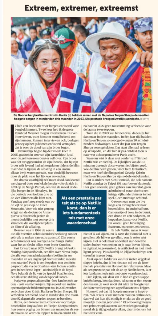 Waarom wist ik daar niet eerder van? Simpel: Netflix was er niet bij. De kijkcijfers van de 101 minuten durende docu waren niet bijster goed. Wie de film heeft gezien, vindt hem fantastisch, maar wie heeft de film gezien? Gevolg: Kristin Harila en Tenjen Sherpa zijn nobele onbekenden.