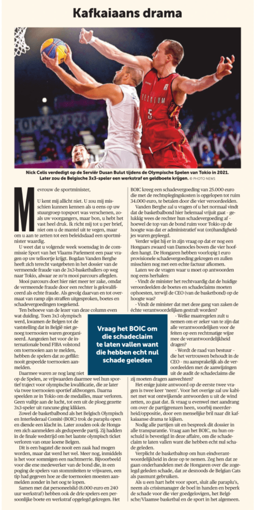 U weet dat u volgende week woensdag in de commissie Sport van het Vlaams Parlement een paar vragen op uw telloortje krijgt. Bogdan Vanden Berghe heeft zich terecht vastgebeten in het dossier van de vermeende fraude van de 3×3-basketballers op weg naar Tokio, alwaar ze zo’n mooi parcours aflegden.