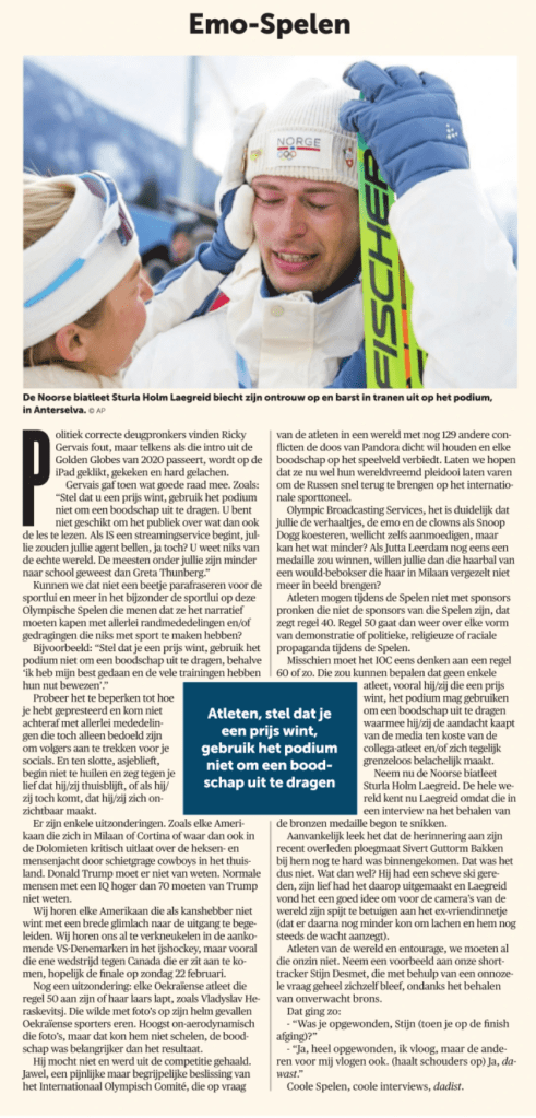 Misschien moet het IOC eens denken aan een regel 60 of zo. Die zou kunnen bepalen dat geen enkele atleet, vooral hij/zij die een prijs wint, het podium mag gebruiken om een boodschap uit te dragen waarmee hij/zij de aandacht kaapt van de media ten koste van de collega-atleet en/of zich tegelijk grenzeloos belachelijk maakt.