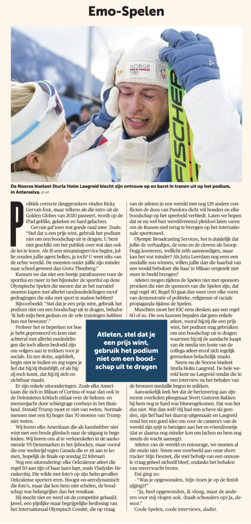 Neem nu de Noorse biatleet Sturla Holm Laegreid. De hele wereld kent nu Laegreid omdat die in een interview na het behalen van de bronzen medaille begon te snikken.