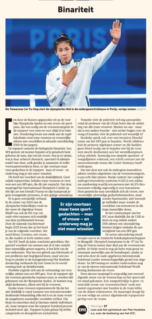 Het IOC heeft de juiste conclusies getrokken. Het sportief voordeel van mensen met al of niet onzichtbare mannelijke genen negeren, is het licht van de zon ontkennen. Was het een gebrek aan informatie of een probleem met begrijpend lezen, maar wat uroloog en pionier in de transgenderzorg Piet Hoebeke donderdag verklaarde bij Gert Geens in De wereld vandaag leek op desinformatie.