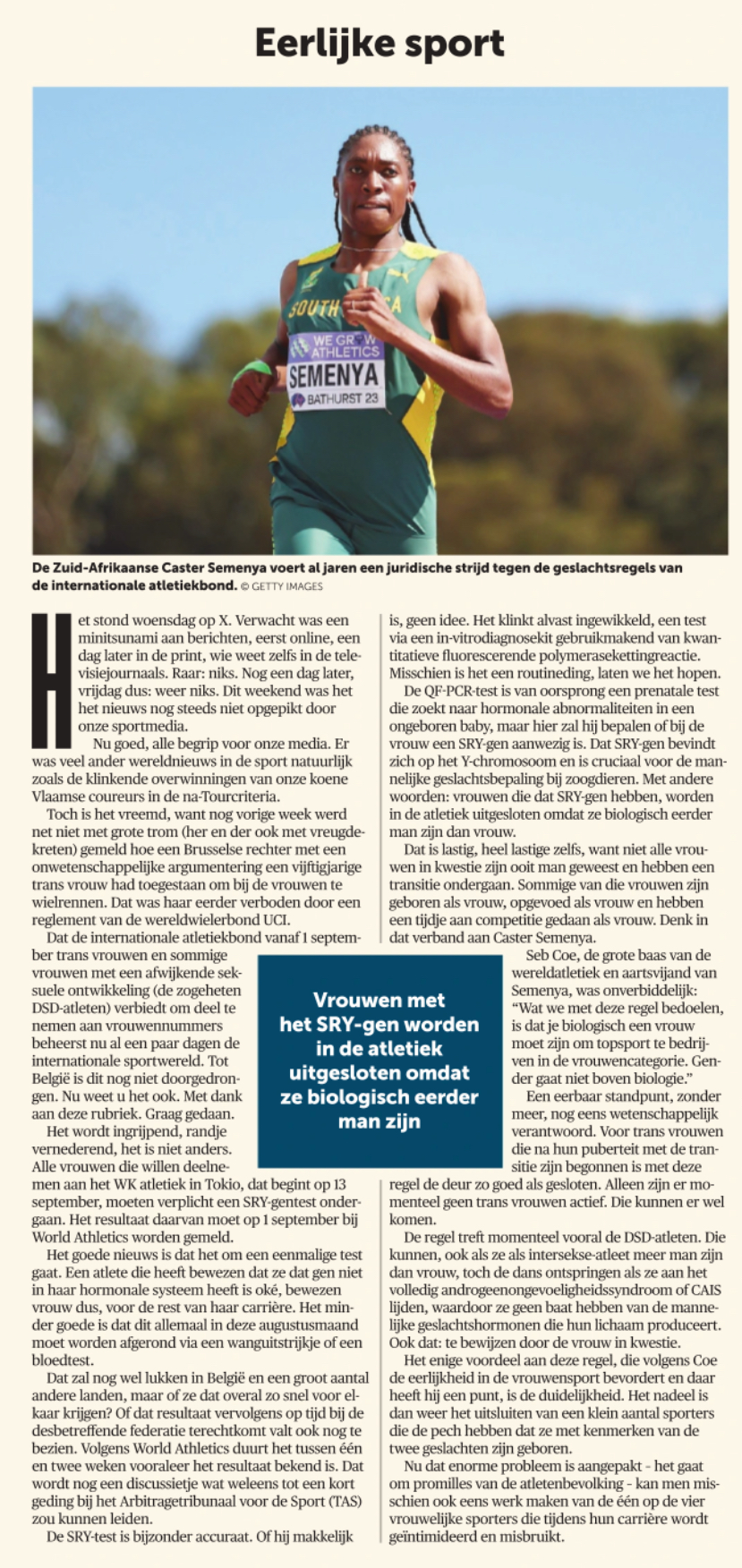 Ook de European Society of Human Genetics liet weten dat de test niet sluitend is om iemand al of niet te weren uit de vrouwensport. Wordt ongetwijfeld vervolgd, misschien al deze week naar aanleiding van het WK atletiek.